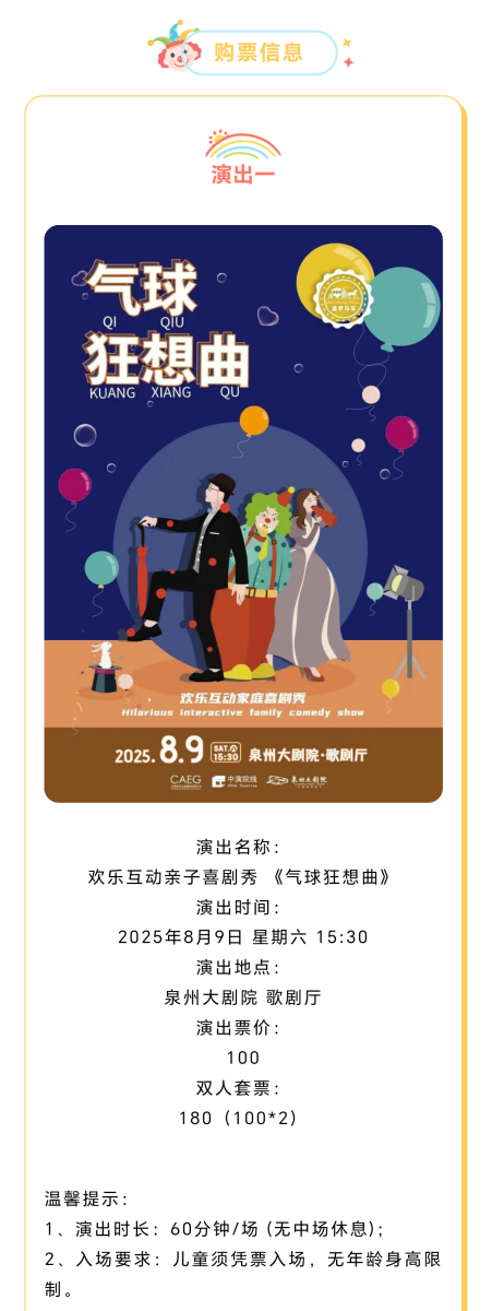 购票优惠:同时购买欢乐互动亲子喜剧秀 《气球狂想曲》、法式幽默儿童剧《小丑时光机》可享7折购票优惠。详见票品【联票狂欢:欢乐互动亲子喜剧秀 《气球狂想曲》&法式幽默儿童剧《小丑时光机》】