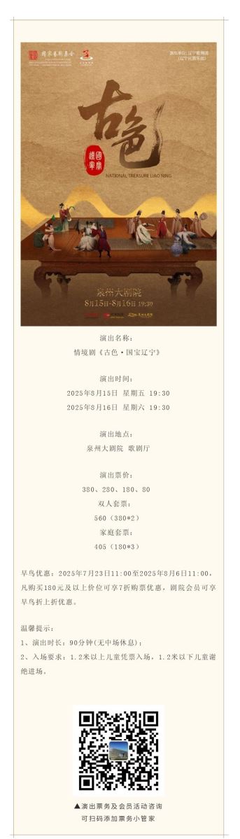 早鸟优惠:2025年7月23日11:00至2025年8月6日11:00,凡购买180元及以上价位可享7折购票优惠,剧院会员可享早鸟折上折优惠。